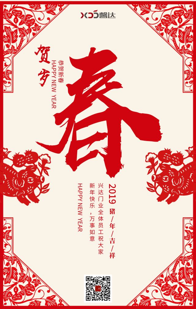 恭 贺 新 春 —Happy New Year— 岁 月 荏 苒 岁月荏苒,流年在指尖匆匆滑落。转眼就是一年,怀抱着岁月的素笺念你如初。 人生如一本书,应该多一些精彩的细节,少一些乏味的字眼;人生如一支歌,应该多一些昂扬的旋律,少一些忧伤的音符! 转眼就一年过去了,不管我们今年过的怎么样,我们还是很期待春节的到来,春节是新的开始,是希望的季节。新的一年,又长大了一岁,有了新的希望。 猪 年 大 吉 再过几天,就是我们中华民族最重要的节日春节了,关于春节,有许多美好的记忆,每一片记忆,都似璀璨的珍珠,在内心深处闪耀,尤其是每逢春节的时候,过着眼前的节日,脑海中闪过往昔的节日,交织成了美丽的、无穷的节日的韵味。 岁 岁 平 安 不管你在今年里遇到了什么?不管你今年过的开心或者不开心?我们都会陪你一起拥抱明年,陪你继续追梦。让我们一起迎接新年的到来,让我们一起努力,一起加油!让我们的2019年红红火火! 恭 喜 发 财 在新的一年里,让我们的祝福像雪花飘送,让我们的问候像绵绵春雨,片片花香,默默祝福,句句心语,声声关怀,连缀着满心愉快,将快乐的音符送给你! 开 工 通 知 尊敬的经销商朋友: 您好! 非常感谢您一直以来对兴达门业的支持与信任,2019年我们将以更好的产品与服务回馈您。 结合公司实际情况,春节开工时间安排如下: ▶正式接单:2019年2月14日(正月初十) ▶正式开工:2019年2月19日(正月十五) 2018完美落幕,感谢有您;2019,我们继续携手前进! 兴达门业 兴达门业提前祝大家新春快乐! 身体健康,福寿绵长! 吉祥如意,财源滚滚 ! 心想事成,万事顺利 ! 猪事顺利,好运平安!